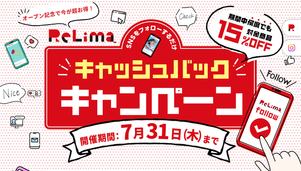 7月31日までの期間限定で、リユース専門ECモール『リリマ』(株式会社ヒバナテクノロジー運営、所在地:東京都港区西麻布・代表取締役:西谷 真一)では、『キャッシュバック』および『インフルエンサー』の2つのキャンペーンを開催しております。