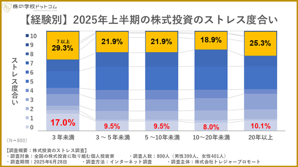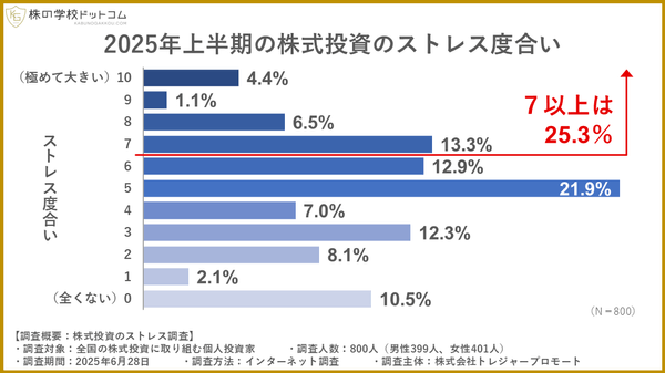 オンライン株式スクール「株の学校ドットコム」(運営会社:株式会社トレジャープロモート、東京都千代田区、代表取締役社長:瀬川 丈)では、株式投資に取り組む全国の個人投資家800人を対象に、2025年上半期の株式投資に関するストレス度についてアンケート調査を実施しました。