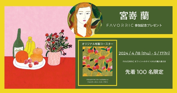 FAVORRIC参加を記念して4月18日(木)~5月17日(金)までの期間中、公式サイトにてご購入いただいた方、先着100名様に「宮嵜蘭オリジナルコースター」をプレゼント!