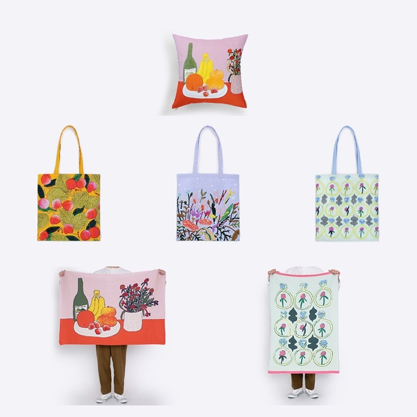 「すももと紫蘇」「MOGU」「ふつうの暮らし」「指輪とお花」の厳選4作品を、人気のクッションとフラットサブバッグにデザインしました。