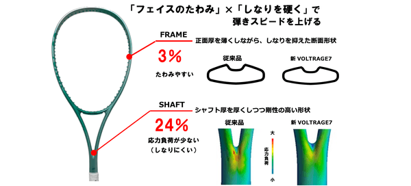 新「VOLTRAGE 7 シリーズ」は、新フレーム形状「02 VOLTRAGE FRAME」を採用。シャフト部の剛性を高め、フェイスがたわみやすい設計により、弾き性能がさらにアップ。また、グロメット筒の根元から大きくストリングを動かす新設計「LEAP OUT TECH」、縦ストリングを中心方向に集めて面圧を高めた「新ストリングパターン」によって強いたわみ戻りを生むことで、快心の弾きと澄み切った打球音を実現。さらに、フレームサイドには新カーボン素材「トレカ®M46X」、フレーム外側にかけて、新カーボンシート素材「MICRO LAMINATE CARBON」を搭載することにより、打球の初速を上げつつ、硬さを抑えたマイルドな打球感を生み出します。