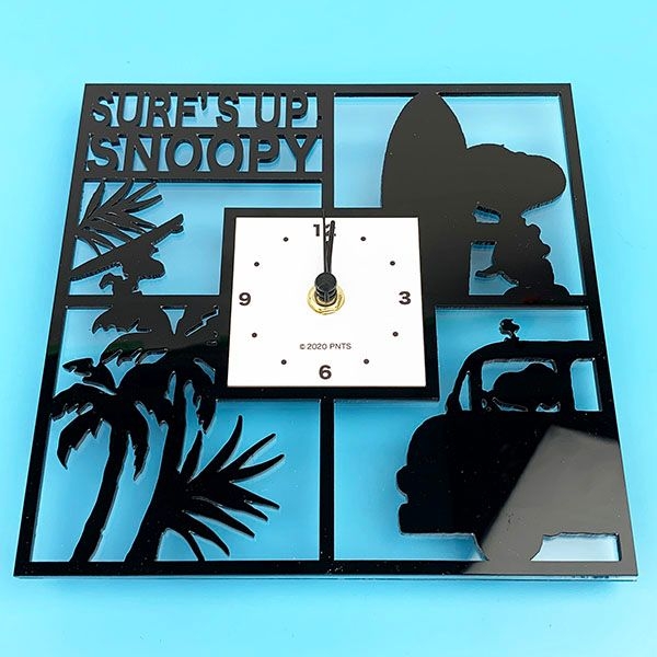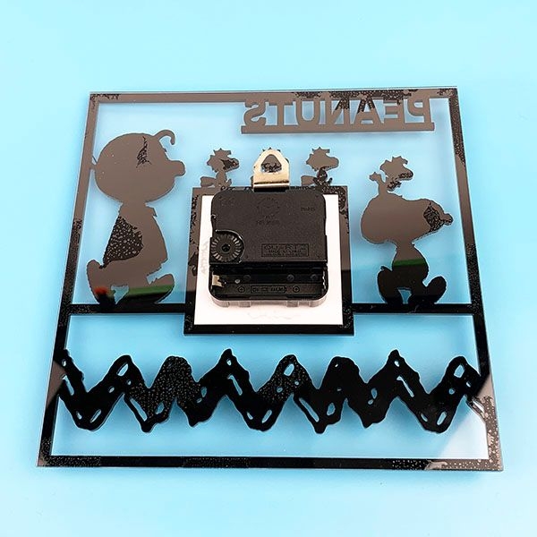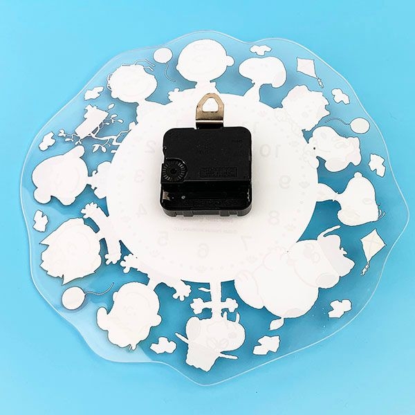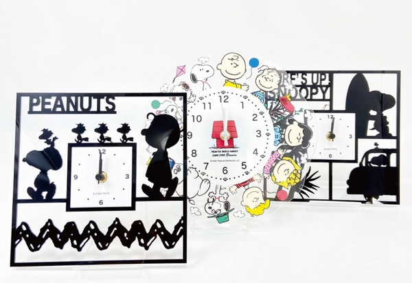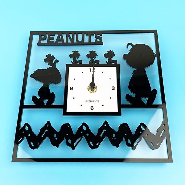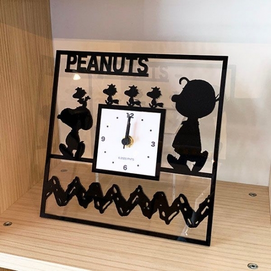 仲良くお散歩中でしょうか。スヌーピーとチャーリーブラウン、ウッドストックたちのシルエットデザインが、とってもオシャレ♪PEANUTSのロゴも入っています。モノクロでシックな雰囲気ですが、アクリルの透明感がどんなお部屋にもマッチしてくれます。