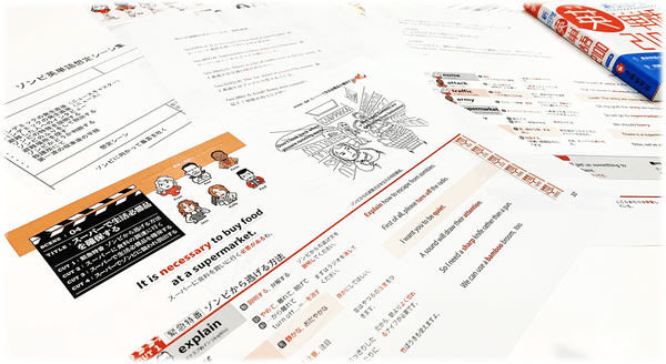 学生は、ゾンビ映画の研究から見えてきた「極限状態では短くてわかりやすいセリフでないと生き残れない」という気づきをヒントに、約1年をかけてストーリー仕立てに例文を書き上げてきました。