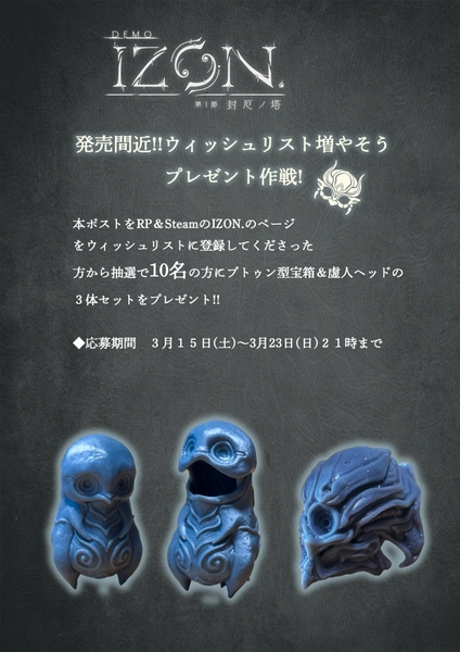 そのほか、『IZON.』の公式Xアカウントでは、ゲームに登場するキャラクター「プトゥン」の形をした宝箱2種と、同じくキャラクターの「虚人」の頭のフィギュア3種セットが抽選であたる発売記念プレゼントキャンペーンを実施中です。