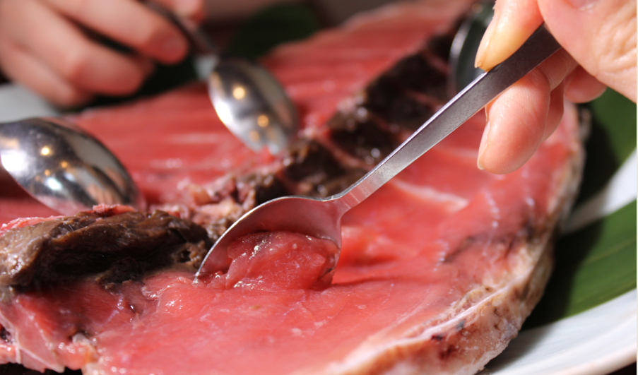 本まぐろの中骨に付いた中落ちをご自身で骨身をスプーンでかき出しながら食べる