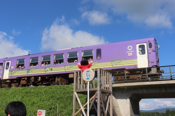 最後は羽後太田会場に足を運ぶと、5種類の稲によって表現された「クレヨンしんちゃん」田んぼアートを間近に、しんちゃんもご満悦の様子。会場を横切る内陸鉄道の乗客へ手を振って田んぼアートと一緒に人々をお出迎えしました。
