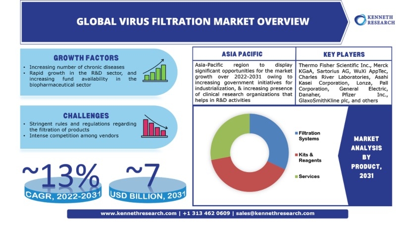 癌、糖尿病、自己免疫疾患などの慢性疾患の増加は、ウイルスろ過の必要性を駆り立てる。世界保健機関(WHO)の報告によると、2020年のがんによる死亡者数は1,000万人近くと推定され、約6人に1人でした。これは、世界のウイルスろ過市場の成長を牽引する重要な要素であり、予測期間、すなわち2022年から2031年にかけて約13%のCAGRで成長することにより、2031年までに約70億米ドルの収益を獲得すると推定されています。