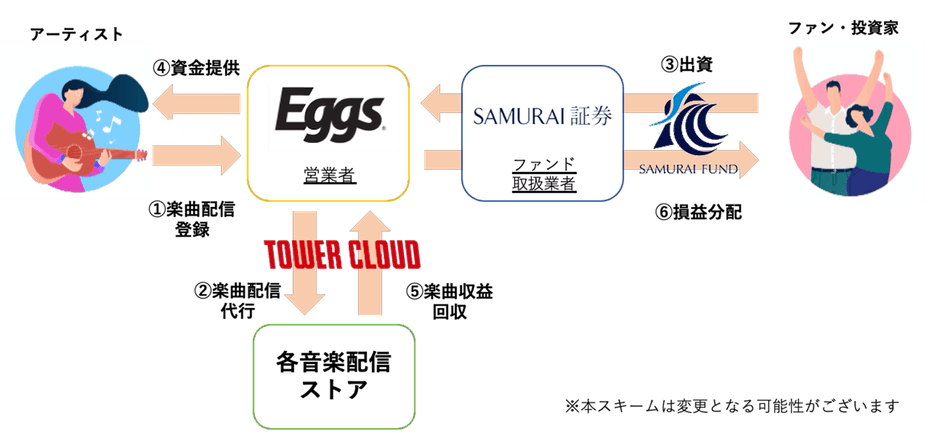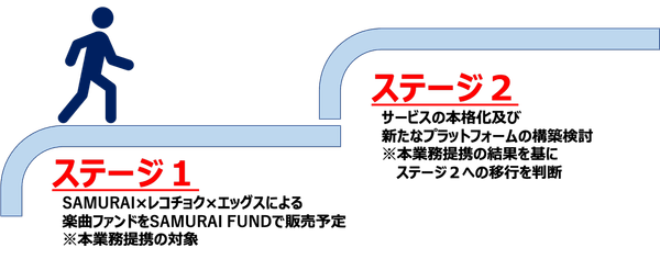 今回の業務提携では、ステージ1としてSAMURAI証券が運営する投資型クラウドファンディングサイト「SAMURAI FUND」(以下、「SAMURAI FUND」)を通じて、アーティストがTOWER CLOUDに登録した楽曲を各音楽配信ストアにて配信することで生じる収益を回収し、それを分配原資とするアーティスト支援のための証券化商品(以下、「楽曲ファンド」)のトライアル実行及びその成果の検証を目的としています。