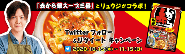 赤から鍋スープ三番×リュウジ Twitterフォロー&リツイートキャンペーン実施 抽選で100名様に商品詰め合わせプレゼント!