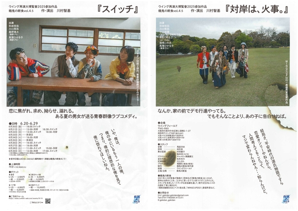 餓鬼の断食vol.4.5『スイッチ』『対岸は、火事。』が2025年6月20日 (金) 〜 2025年6月29日 (日)にウイングフィールド(大阪)(大阪府 大阪市中央区 東心斎橋 2-1-27)にて上演されます。