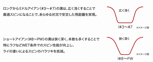 最適なスピンを生み出し、状況に応じたパフォーマンスを発揮する「番手別溝設計」であらゆる状況でも安定した飛距離を実現します。