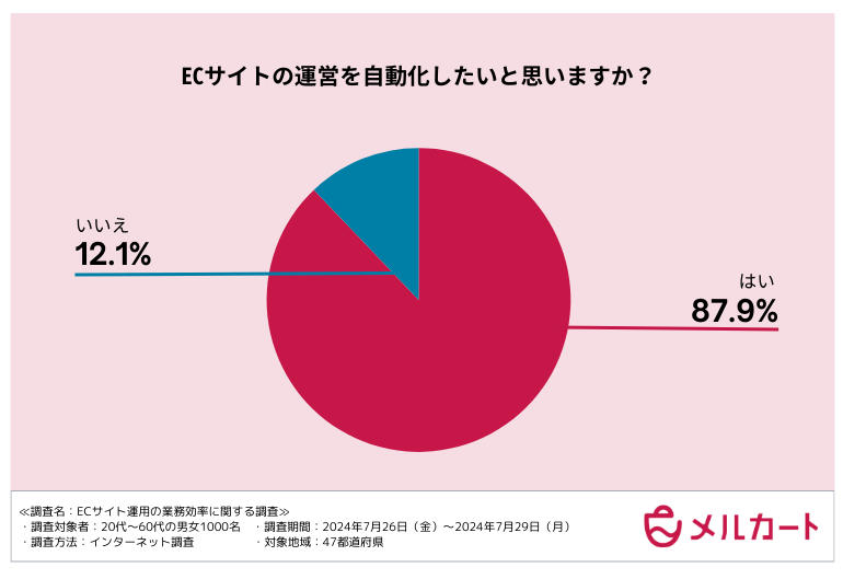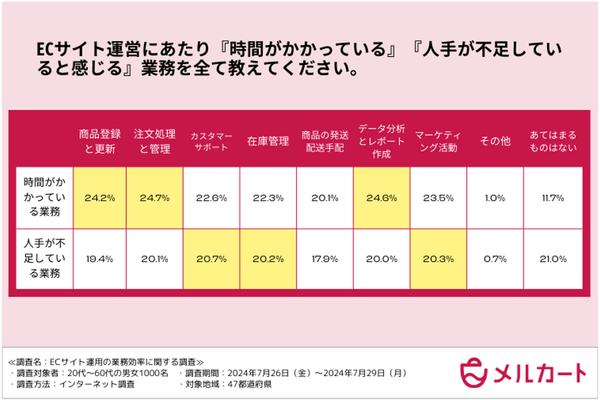 クラウドECサイト構築プラットフォーム「メルカート」を提供する株式会社エートゥジェイ(東京都港区/代表取締役社長 飛鷹 祐哉)は、ECサイトの運用経験のある全国の20代~50代の男女1000名を対象に、ECサイトの運営の業務効率に関する調査を実施しました。