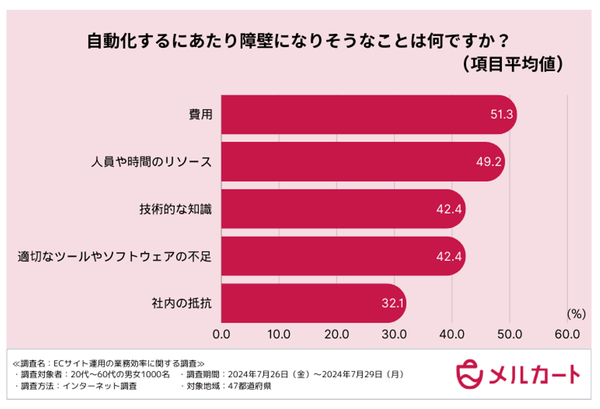 ECサイト運営者が業務自動化を進める上で直面している主要な障壁として、「費用」と「人員および時間のリソース」が挙げられました。約半数の回答者がこれらの要因を障壁と感じていることから、自動化ツールの導入に対する経済的および人的負担が大きな課題であることが明らかになりました。