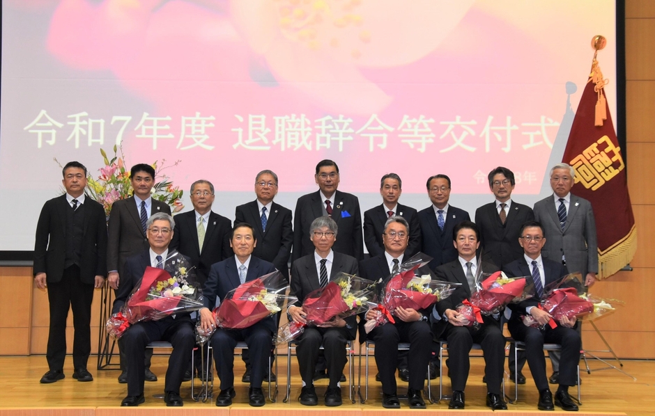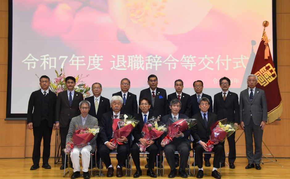 令和7年度の定年退職者辞令等交付式が3月31日、天白キャンパス共通講義棟北の名城ホールで開催され、この日で定年退職して大学のキャンパスや附属高校の校舎に別れを告げる教職員15人(選択定年を含む)のうち11人が出席。小原章裕理事長から感謝状と記念品、野口光宣学長から花束が贈られました。