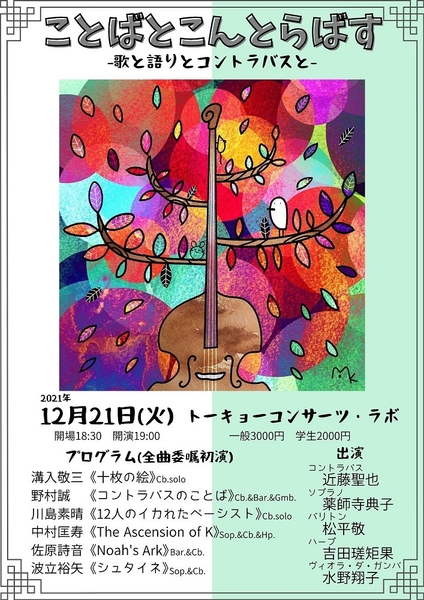 こんどらベースオブアーツ(代表:近藤聖也)主催による『ことばとこんとらばす』が2021年12月21日 (火)にトーキョーコンサーツ・ラボ(東京都新宿区)にて開催されます。チケットはカンフェティ(運営:ロングランプランニング株式会社、東京都新宿区、代表取締役:榑松 大剛)にて発売中です。