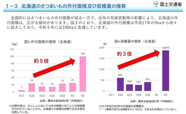 さてさて。そもそもの話ですが「なんで北海道でサツマイモ?」と思われる方も多いでしょう。「北海道といえば、ジャガイモじゃないの?」と。暖かい地方で栽培が盛んというイメージが強いですよね。しかししかし! 最近では、北海道でも生産量が急増しているのです。