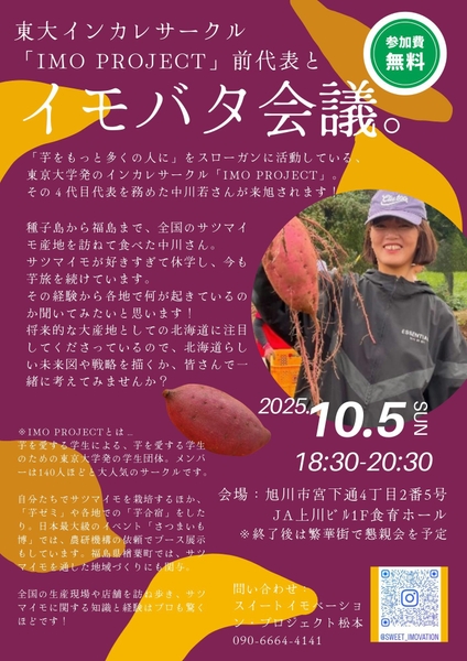 東京大学発のインカレサークルの元代表に旭川まで来ていただき、道外からの視点で、北海道のサツマイモのこれからを展望してもらうというもの。サツマイモ関係者同士でネットワークができればなという狙いもあります。例えばJAや市町村の境界を挟むと、お互いを知らない、ということはよくありますからね。