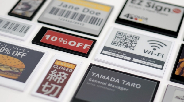 これにより、紙の名札・案内板・価格POP・受付表示など、頻繁に差し替えが必要な運用を効率化できます。