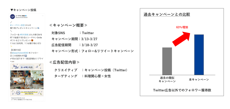 この度、はごろもフーズ株式会社協力のもと、Twitterキャンペーンにおける「ソーシャルディスプレイ広告」のテスト配信を行ったところ、多くのユーザーがTwitterアカウントへ流入し、Twitter広告経由以外での新規フォロワー獲得数は、過去の類似キャンペーンと比較して63%増加する結果となりました。