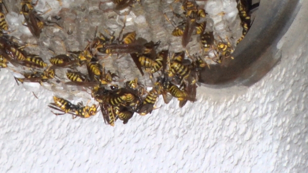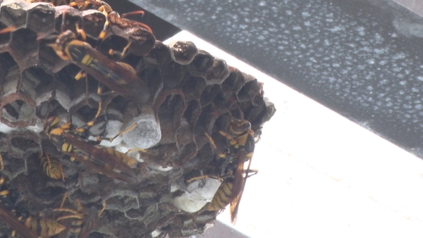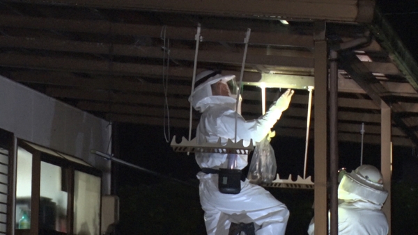 次は「数日前に夫がハチに刺された。家の近くに巣があるのでは?」と依頼があった民家へ。巣の場所を捜索すること30分。周士さんが、素人目には気づきにくい玄関の上にある屋根の軒下にハチの巣を見つけました。