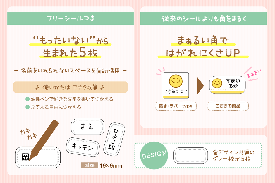 さらに「もったいない」の観点からうまれたフリーシール5枚つき。お名前はもちろん、お好みの文字を油性マジックで書いて使うことができます。