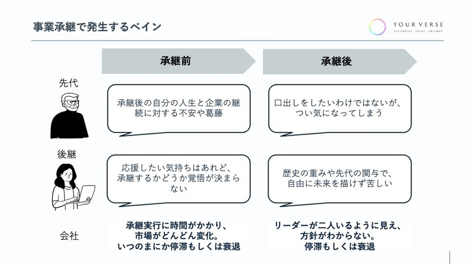 事業承継においては、承継の前後において、先代と後継の個人が抱えるペインと、組織自体が抱えるペインの両方があります。