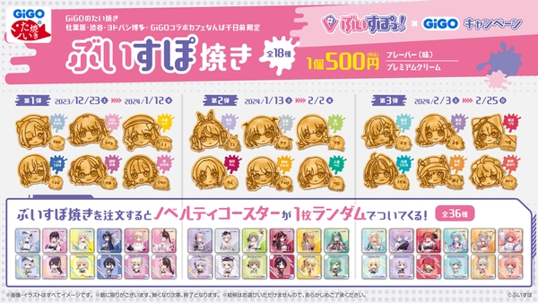 GiGOのたい焼きで、ぶいすぽっ!メンバーをモチーフとしたたい焼きを販売いたします。1点購入ごとにオリジナルコースターをランダムで1枚進呈。たい焼きのメンバーともらえるノベルティは期間ごとに切り替わります。