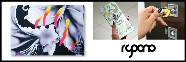昨年12月に、当社の「レイヤー箔プリントサービス」の開始を記念しキンコーズ・渋谷店で「RYOONO」とのコラボレーション展示およびグッズ販売を行いました。 好評を得たコラボレーショングッズを今回増版し、新たに池袋エリア、神奈川エリアのキンコーズ4店舗で販売することにしました。