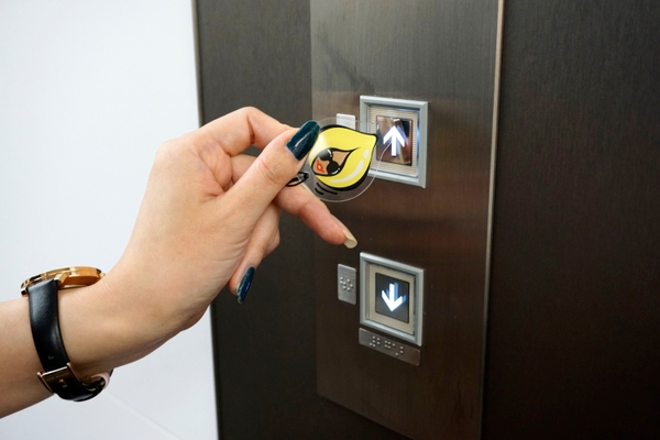 エレベーターなどの加圧式のボタンの押下時に、直接ふれることなく安心を持ち運ぶ感染対策商品「タッチボタンストラップ」の「RYOONO」コラボデザインです。