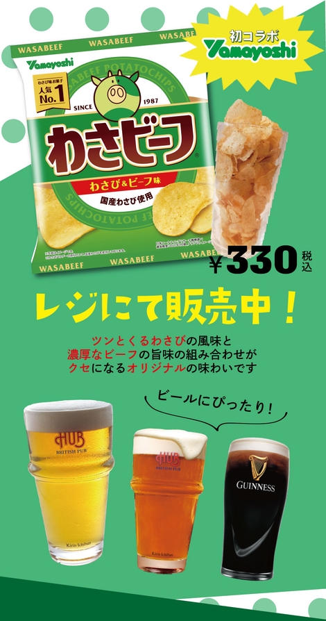 株式会社ハブ(本社:東京都千代田区、代表取締役社長:太田 剛)は一部店舗において、山芳製菓株式会社(本社:東京都板橋区、代表取締役社長:山﨑光博)の人気スナック菓子「わさビーフ」と期間限定でコラボレーション企画を実施いたします。
