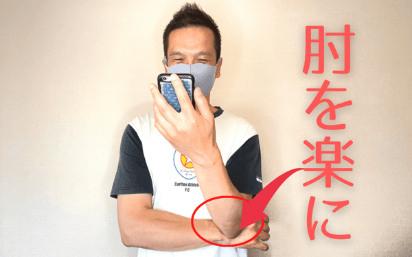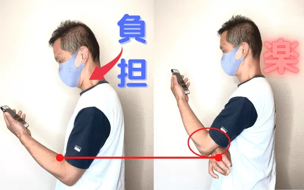 ポイントは、スマートフォンを持つ反対側の手首を利用して肘を楽にさせるだけです。次の横からの画像で比較をすると肘の高さが変わることで、うつむき姿勢が改善されていることが分かります。