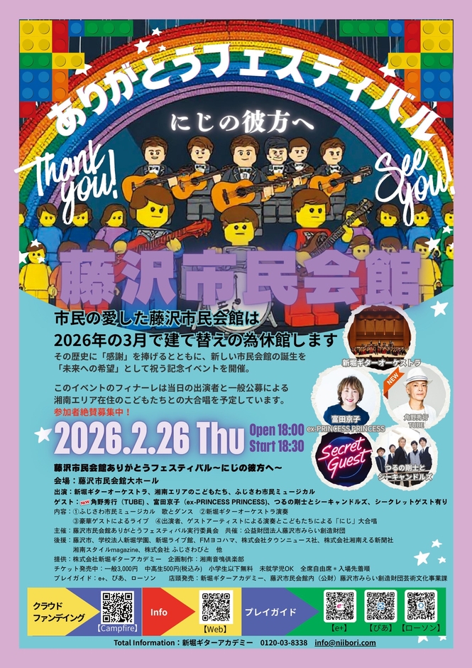 - お問合せ: 藤沢市民会館ありがとうフェスティバル実行委員会事務局 0120-03-8338 info@niibori.com(新堀ギター総合案内)