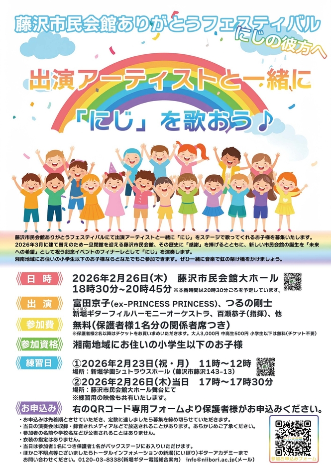 フィナーレでは、出演アーティストと湘南エリアの子どもたちによる「にじ」の大合唱が行われます。この合唱はレコーディングされ、レディオ湘南など地元FM局でのオンエアも予定されており、音楽を通じて市民会館への感謝と地域文化継承の思いを広く伝えていきます。