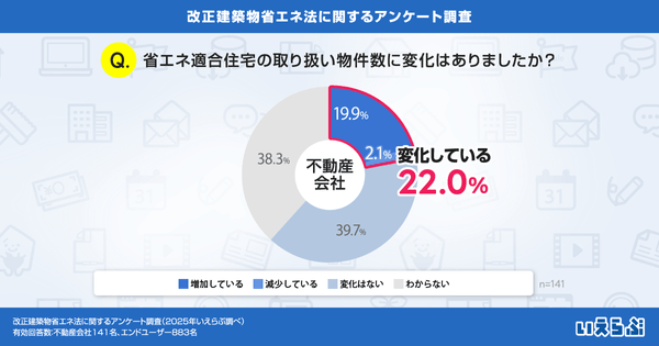 しかし、不動産会社に「省エネ適合住宅の取り扱い物件数に変化はありましたか?」という質問をしたところ、「変化はない」が39.7%となりました。さらに「わからない」も38.3%と高い割合を示しており、多くの不動産会社が市場の変化を正確に把握できていない実態が明らかになりました。