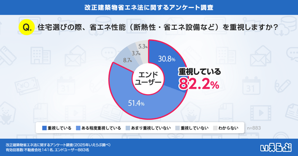 不動産会社側の対応が遅れる一方で、エンドユーザーの省エネ性能への関心は非常に高いことが本調査で明らかになりました。住宅選びの際に省エネ性能(断熱性・省エネ設備など)を重視するか尋ねたところ、エンドユーザーの30.8%が「重視している」、51.4%が「ある程度重視している」 と回答。