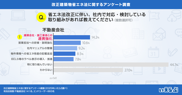 一方で、既に具体的な準備を進めているところも見られ、「建築会社・施工業者との連携強化」が14.2%、「営業担当への研修・説明強化」が10.6%、「社内マニュアルの整備」が9.2%といった取り組みが挙げられています。