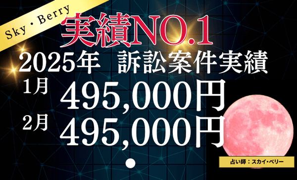 現在のスマホのリアル鑑定市場を構築するキカッケを作ったのは、現在、占い師 スカイ・ベリーとして活動する占い師です。2025年も、対企業の訴訟案件で毎月連続して実績をあげています。弁護士相手に何もさせず、通常裁判なら早くとも半年から数年かかるところを2か月以内に解決しています。