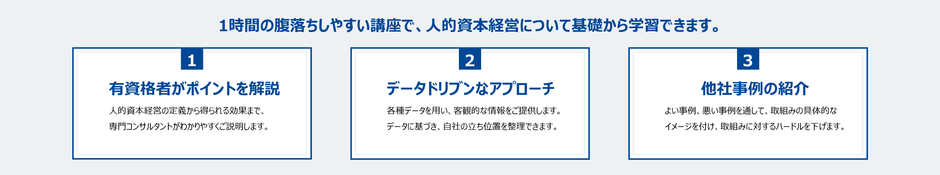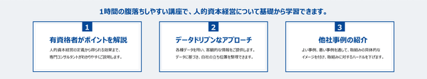 本講座は、人事部に加え経営層や経営管理部、事業責任者、IR担当者など、企業経営の根幹となる「組織」を支える方々に、人的資本経営の正しい知識と理解を深めていただくことができます。有資格者によるデータを用いたご説明で、自社の立ち位置を把握し、他社事例を見ながらどんなことに取り組むべきか、議論ができるようになります。講座は1時間で、WEBもしくは対面にて開催可能です。業種、規模、上場/非上場を問わず、ご満足いただける内容となっています。お客様のご要望、お悩みに応じて、内容や講義時間をカスタマイズできるプランもご用意していますので、プラン詳細は弊社HPをご覧ください。