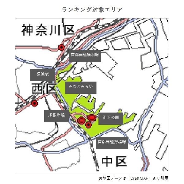 「マンションレビュー」が保有する横浜市神奈川区・中区・西区の3区の中古マンションデータより、地図内の緑の対象エリア内にある143件に限定して「坪単価」と「新築時からの騰落率」をランキング化。