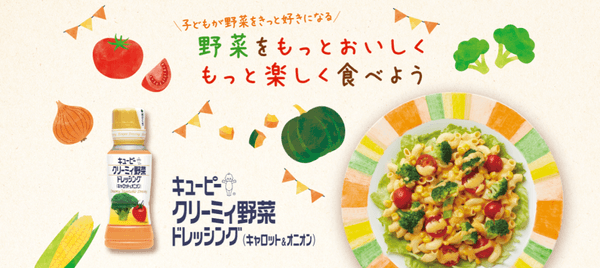 「キユーピー クリーミィ野菜ドレッシング(キャロット&オニオン)」は、子どもが苦手な野菜の苦みや香りをマスキングする工夫をしていて、甘みを感じる食べやすい仕立てになっています。子どもが好きな野菜や食材を使い、子どもと一緒に作れるように、特設サイトでレシピや動画をご紹介しています。ぜひ、ご覧ください!
