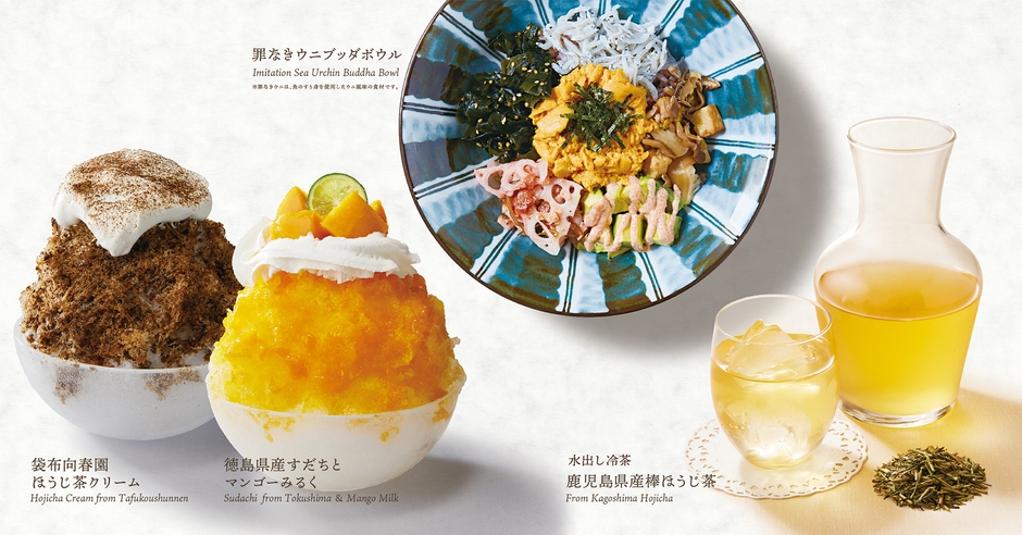 「天然水の削り氷 袋布向春園ほうじ茶クリーム 950円(税込1,045円)」は、天然水の削り氷に、袋布向春園のほうじ茶を使用した“自家製ほうじ茶ソース”をたっぷり加え、ホイップをトッピング。削り氷の中には、ゆであずきがふんだんに入っているので、最後の最後までお楽しみいただけます。「天然水の削り氷 徳島県産すだちとマンゴーみるく 1300円(税込1,430円)」は、マンゴープリンが入った天然水の削り氷に、“マンゴーと徳島県産のすだちを使用したオリジナルソース”を加え、ホイップとマンゴー&すだちをトッピング。さっぱりとした上品な味わいに仕上げました。練乳ソースをかけてお召し上がりいただくと、ミルキーな味わいもお楽しみいただけます。