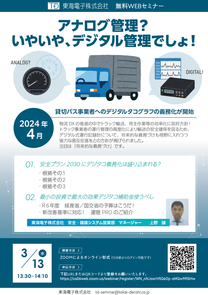 アルコール検知システム、 IT点呼システム、 運行管理システムを開発・販売する東海電子株式会社(本社:静岡県富士市 代表取締役 杉本 哲也)は、 この度、トラック事業者様の将来的なデジタコ義務づけを視野に入れ「アナログ管理? いやいや、デジタル管理でしょ!」無料ウェビナーを3月13日(水)に開催いたします。