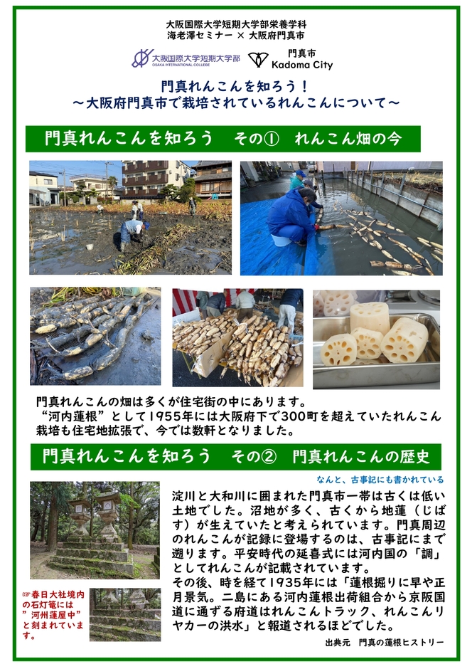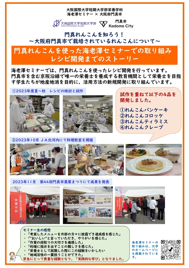海老澤セミナーでは大学近隣の農産物である門真市の伝統野菜である「門真れんこん」の活用やキッチンサイエンスについて研究しています。また、栄養学科では地域共催イベントの実施をはじめ、近隣自治体での様々な食育イベントに参加しています。食と栄養の専門職である栄養士養成機関として、”食”をとおした地域社会とのつながりについて、発表しました。