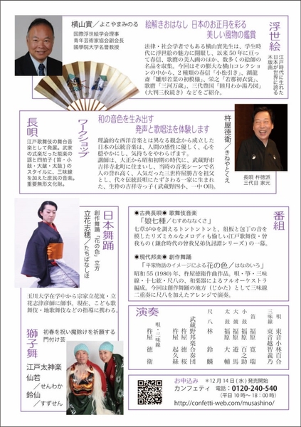尺八と三味線二重奏曲に、新たに日本舞踊の古典的手法で振付た創作舞踊も。重要無形文化財である長唄の発声・歌唱法のワークショップも体験できる。日本古来の美術と音曲と舞踊を一堂に味わえる、お正月の福袋的鑑賞会。