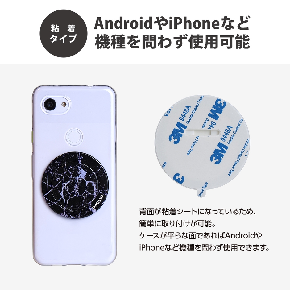 粘着タイプは、背面が粘着シートになっていて、ケースが平らな面であればAndroidやiPhoneなど機種を問わず使用できます。(特殊な塗装や加工がされたケースでは使用できない場合があります。)
