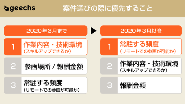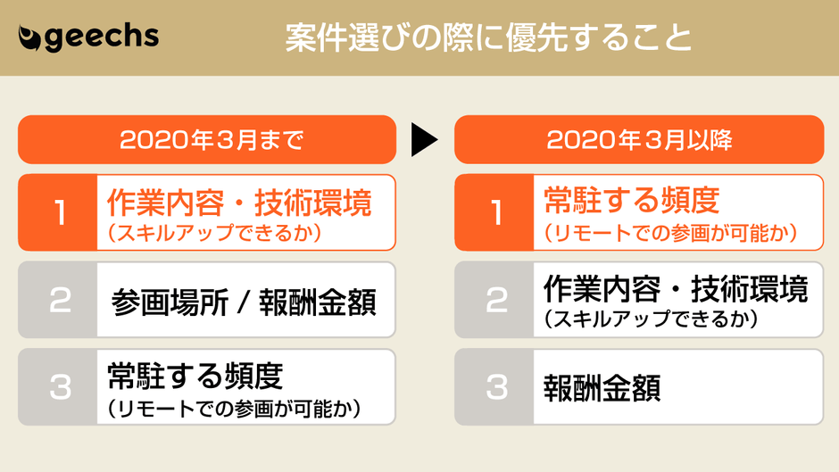 調査結果①:案件を選ぶ時に優先する条件は「作業内容・技術環境(スキルアップできるか)」から「常駐する頻度(リモートでの参画が可能か)」に変化