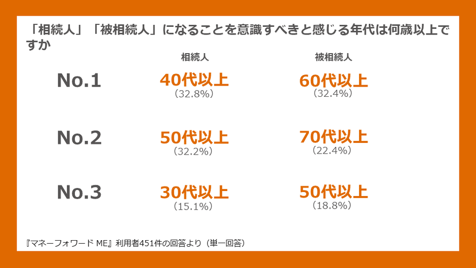 実際に自分自身が相続人・被相続人になることを意識すべき年代と感じるのは、相続人として「40代以上(32.8%)」、被相続人として「60代以上(32.4%)」が挙がりました。遺族として資産を受け取る側と、資産を遺す側に回ることを考え始める年齢には、やや乖離があるようです。