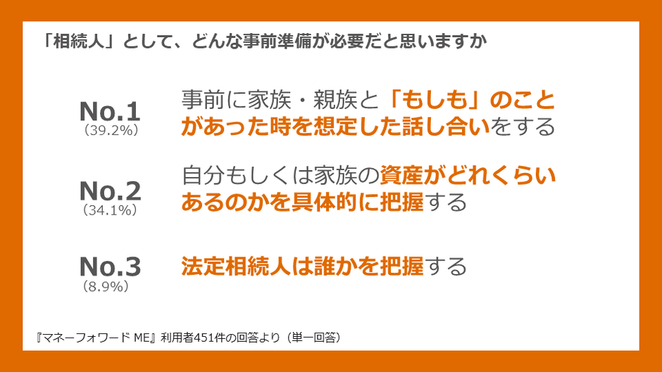 将来の相続に向けて必要だと思う事前準備として、相続人・被相続人のどちらの立場でも「事前に家族・親族と『もしも』のことがあった時を想定した話し合いをする」が最も多く挙がりました。また、「自分もしくは家族の資産がどれくらいあるのかを具体的に把握する」ことも次点にあがり、大切な準備として認識されているようです。