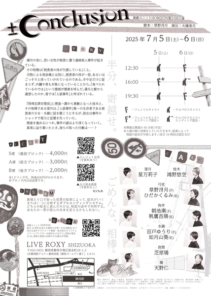 演劇ユニットHORIZONは、2025年7月5日 (土) 6日 (日)に静岡県高架下のLIVE ROXY SHIZUOKAにて、観客参加型のマルチエンディング演劇『±Conclusion』を上演いたします。