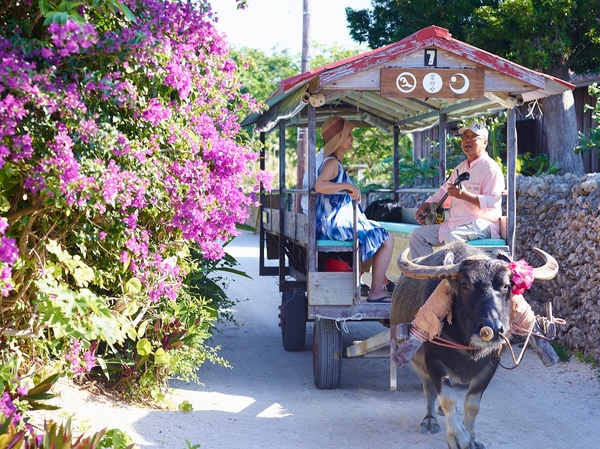 水牛車を貸し切り、重要伝統的建造物群保存地区に指定されている島の集落を巡ります。赤瓦の屋根や真っ白な珊瑚の白砂の道、石垣を囲む色鮮やかな花々など、沖縄の原風景が残る竹富島の風景を眺め、ガイドが語る竹富島の話を楽しみます。ガイドが演奏する三線の音色にも耳を傾けながら、竹富島の島文化に浸る体験です。